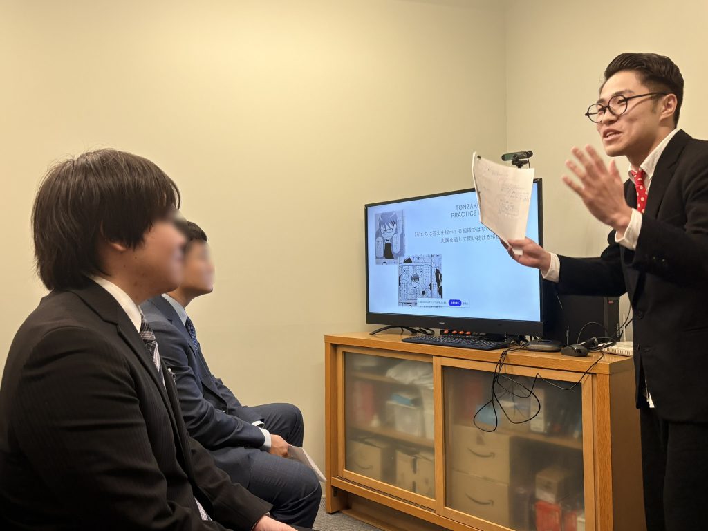 若手先輩社員からは、思いもよらない個性的なプレゼンと、会社理念にうまくからめた熱い歓迎メッセージをいただき、緊張感漂う会議室の空気を一変させてくれました。